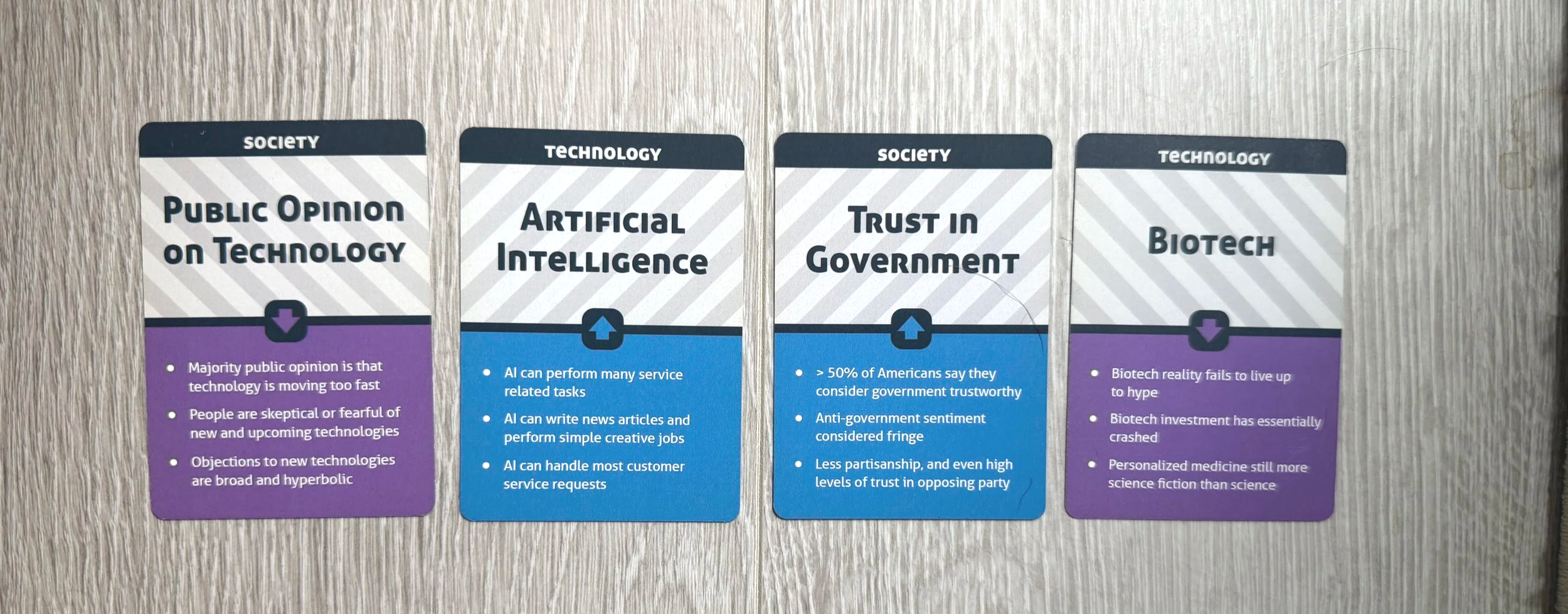 The creators of this game held a working session with these cards, and used that to create a series of briefs (or scenarios) that then informed short stories by Science-Fiction authors.