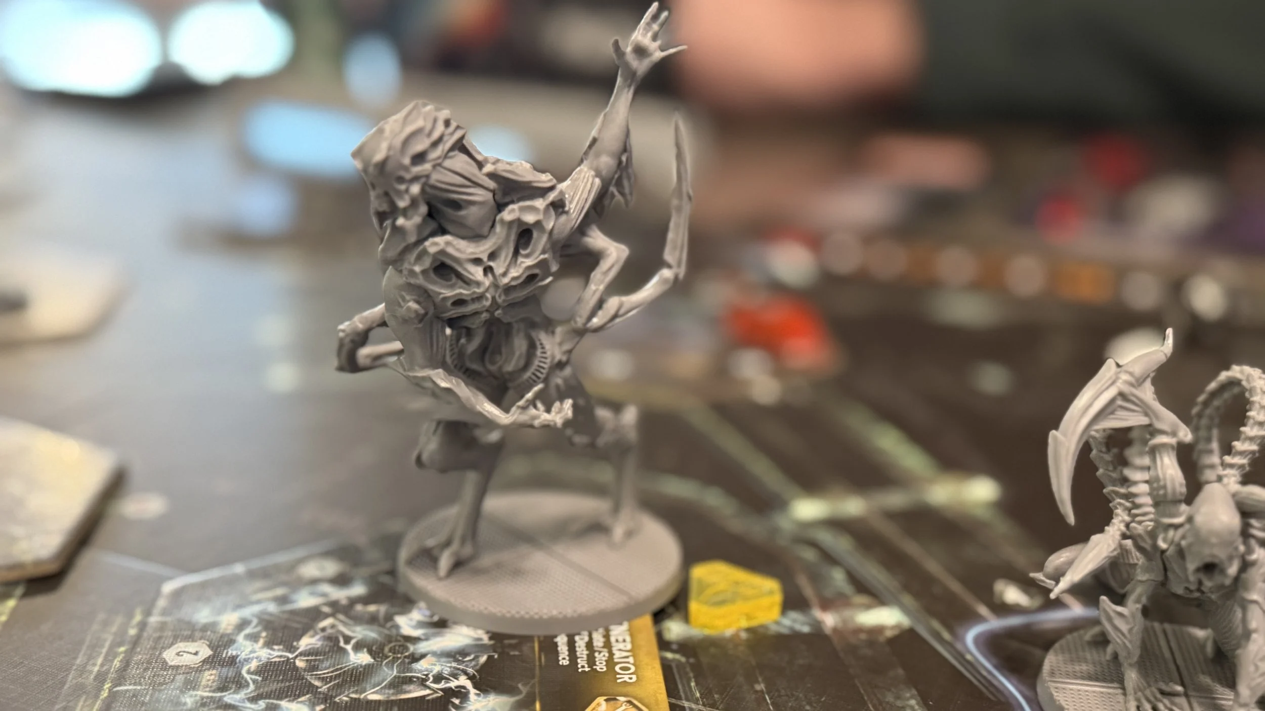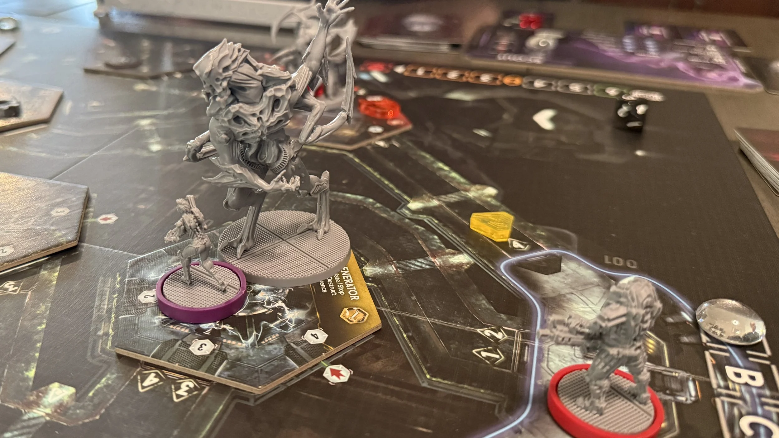 The minis that come with the game are small for the player characters and massive for the aliens. This physicality makes them feel like the big dangerous baddies that they are.