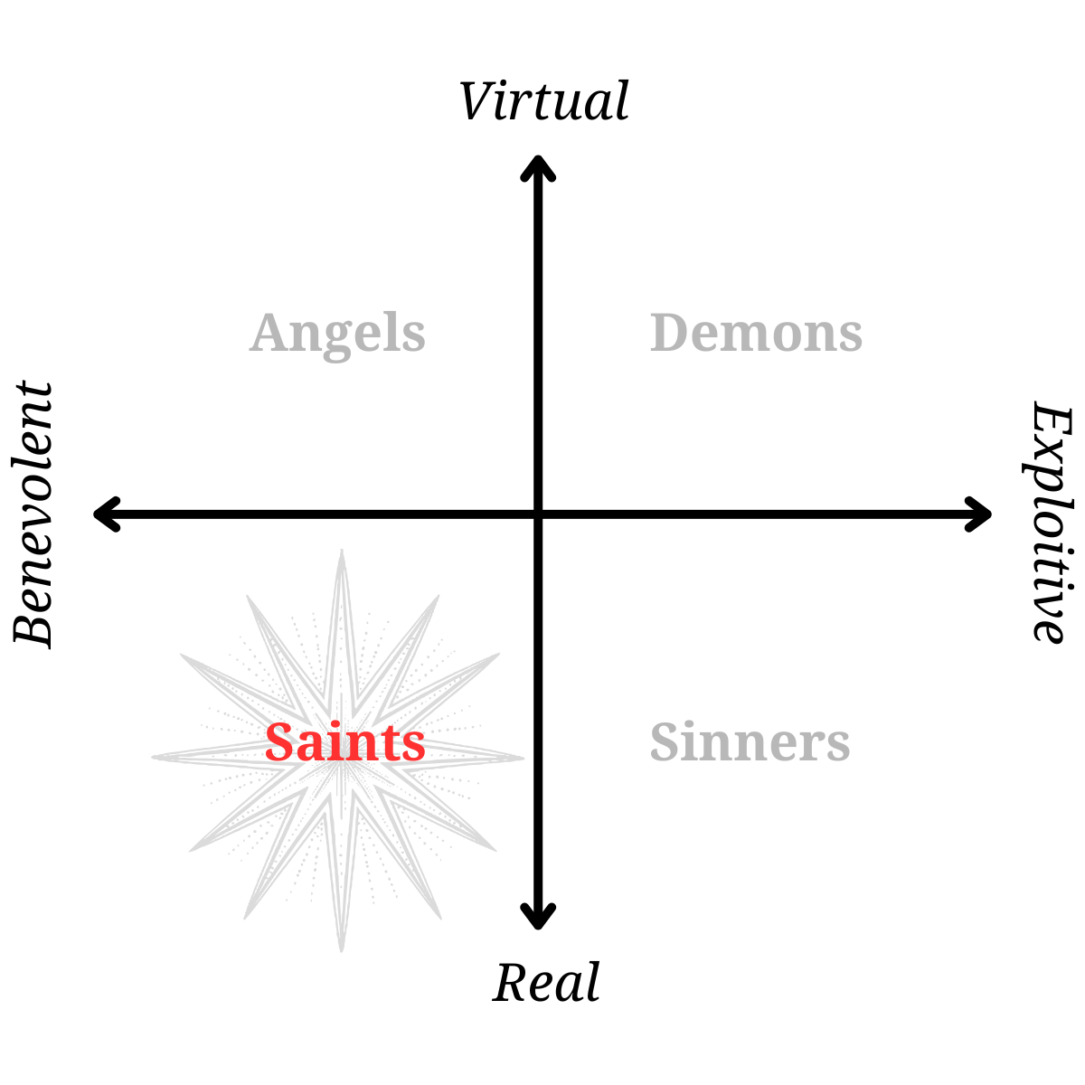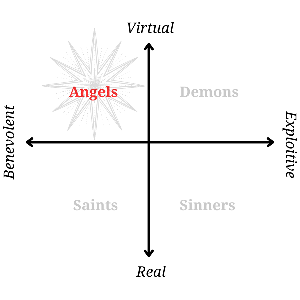 In the Virtual-Benevolent quadrant, Angels will patrol the etherial cyberspace of the future. They’ll be few and far between, and will play a role in helping us navigate the possibilities of a virtual world.