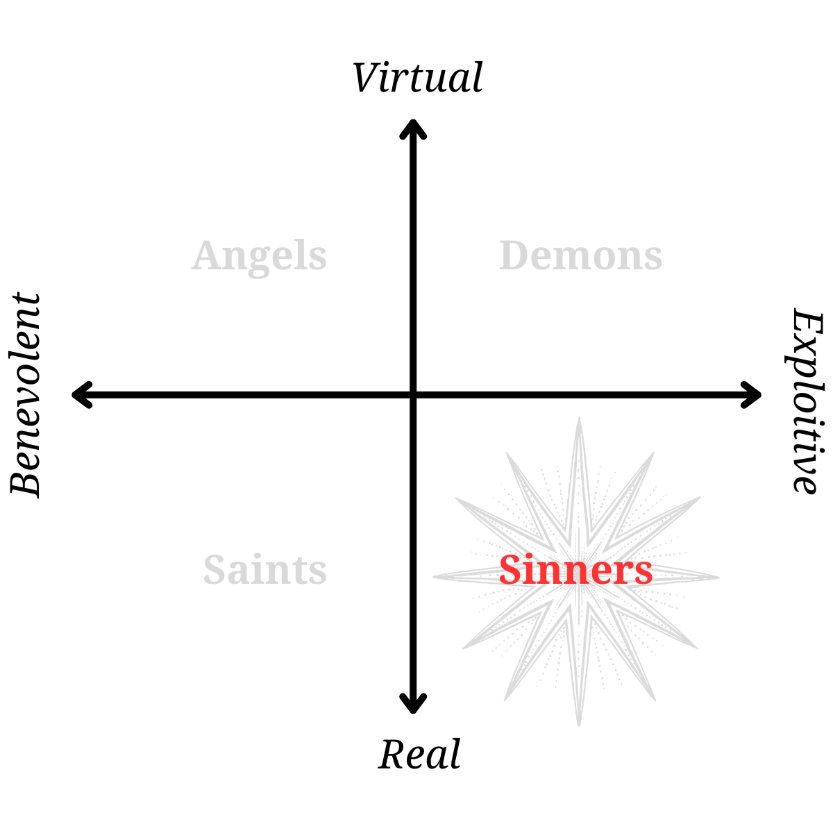 In the Real-Exploitive quadrant Sinners will have not yet exchanged their flesh for full virtual immersion, and will remain in meatspace to extract value for shareholders and soul from humanity.